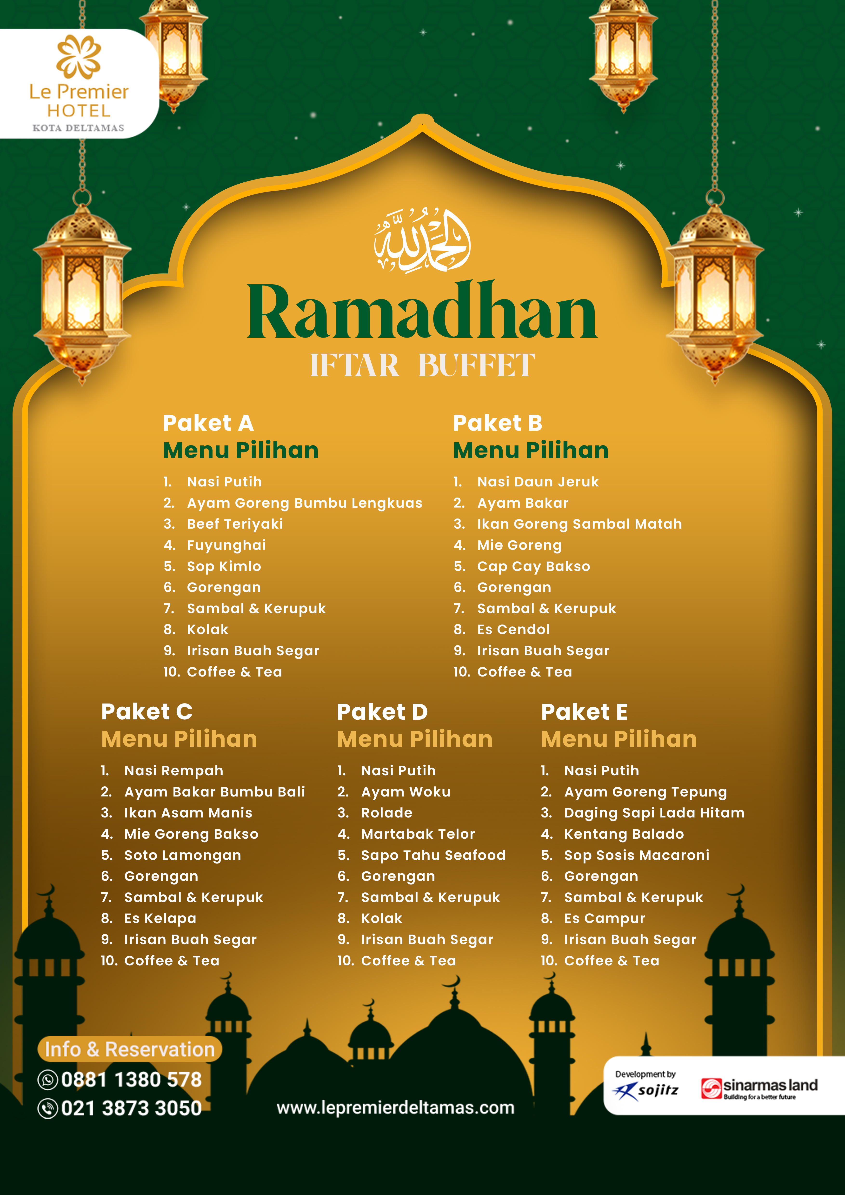 Selamat datang di bulan suci Ramadhan. Nikmati hidangan lezat berbuka puasa bersama di Hotel Le Premier Kota Deltamas. Dapatkan pengalaman istimewa melalui menu spesial kami, cita rasa Indonesia. Cocok untuk berbuka bersama teman, keluarga dan relasi.